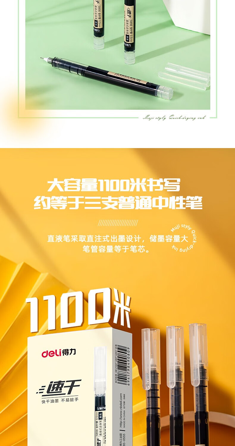 得力(deli)直液笔速干笔签字笔 0.5mm全针管中性笔 商务办公学生水笔走珠笔 黑色 12支/盒
